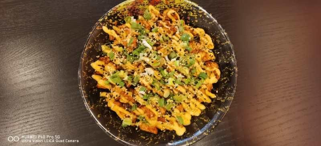 Dés de saumon frit sur du riz vinaigré, sauce terriyaki, sauce spicy, oignon frits, oignon vert et sésames.