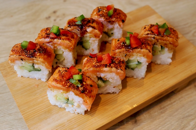 California sans nori, avec sauce spicy, concombre, saumon flambé à la sauce terriyaki, épices japonaise, poivrons et sésames.